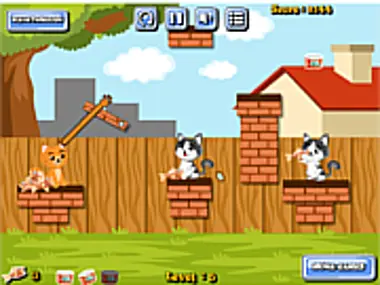 两只猫在后院里玩得很开心。它们正在一起分享鱼。然而,灰猫在平台的另一边,橘猫必须把鱼扔给它的伙伴灰猫,而且自己不能掉到地上。帮助橘猫成功地把鱼传递给橘猫。