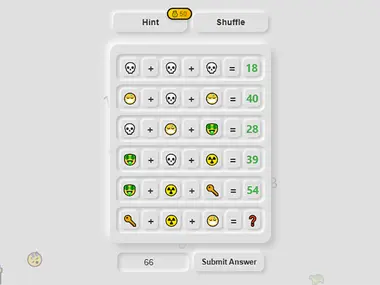 Emoji Math Quiz 让数字充满乐趣!解决创意的数学谜题,表情符号取代数字,考验你的逻辑思维能力。非常适合喜欢充满趣味创意的脑筋急转弯的儿童和成人!立即在Y8畅玩Emoji Math Quiz游戏。