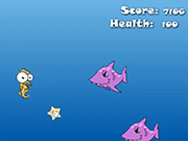 使用空格键控制你的海马的深度。收集星星可获得奖励和生命值,但要避开鲨鱼..