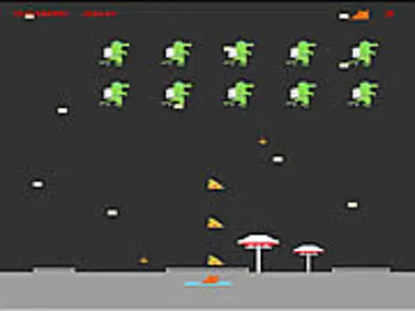A space-invaders like game with a flying kitty, pizzas, and jetpack lizards.