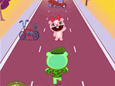 在进行了大量锻炼后,Flippy遇到了正在骑自行车的Toothy。自行车的一个轮胎被一个图钉扎破了,Flippy捡起了它。但Toothy撞上了一个垃圾桶,并被一个邮箱斩首了。Flippy将一个旧菠萝想象成手榴弹,紧张地逃离了现场,却发现路上有更多的危险。 帮助Flippy尽可能地跑远,使用左右方向键进行移动。需要避开的障碍物包括车辆、物体和其他角色。上下方向键分别用于跳跃和滑行。
