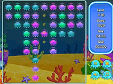 Remove as many jellyfish as indicated. Drag rows and create groups of 3 or more of the same connected jellyfish. Reach the goal on the right.