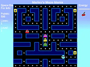 Marley's Maze Mania 是一款街机风格的游戏,玩家在其中躲避幽灵,并尝试清除迷宫中所有的点。策略性地使用能量罐来赋予你力量,以暂时消灭幽灵。如果你达到 10000 分,可获得一条额外生命。