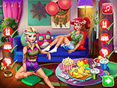 两位公主正准备度过一个激动人心、精彩绝伦的电影之夜,观看她们最喜欢的电影,但她们需要你的帮助来装饰房间,并挑选她们应该吃什么零食。最后,你可以给她们酷炫的3D眼镜,并为她们找到一套舒适的服装,适合在她们最喜欢的电影前放松!