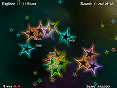 一个美丽的、基于分数的连锁反应游戏,在其中,点击星星会引发绚丽的色彩和声音爆发。使用鼠标引发第一次爆炸,并点击足够的星星以进入下一关。