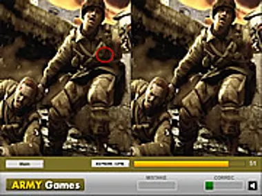 Soldiers In Action Difference 是一个非常刺激的游戏。在这个游戏中,你必须找出两张图片之间的不同之处。游戏共有5个关卡。在每个关卡中,都有两张图片包含五个不同之处。你的任务就是在每个关卡中找出这五个不同之处。几乎每个关卡的图片都展示了英勇的士兵在行动。此外,你必须在规定的时间内找出这五个不同之处才能赢得关卡,并进入下一个关卡。不要犯超过5个错误,否则你可能会失败,并需要从头开始。请使用你的鼠标来玩这个游戏。使用鼠标左键点击不同之处。务必全神贯注,因为这个游戏相当困难,在规定时间内找出不同之处可不容易。祝你玩得开心!