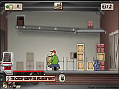 You play a chubby warehouse boss who must load boxes onto trucks that pull into the dock. Each stack is outlined on the back of the truck, all you have to do is carry the crates one by one and put them in the right place. It's a very straightforward game that keeps you hooked with its charming presentation and simple gameplay.As you run back and forth organizing crates you might see a mouse, cat or dog wander into the room. On their own the animals usually don't interfere with your work, but put them together and you've got trouble. The cat will chase the mouse and sometimes knock you down, while the mouse can destroy crates or bite the dog, sending the poor hound running and toppling stacks of boxes.