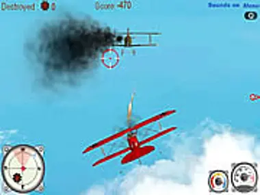 当战机停在草坪上时,按下 W 键,战机开始加速滑行,注意保持战机有一定的仰角,不要让战机坠毁。移动鼠标控制战机,你可以在左下角看到小地图,不要飞离基地太远。否则,你将被视为逃兵并受到惩罚。使用瞄准镜瞄准敌机,然后按下鼠标左键开火,射击一段时间后,松开鼠标按钮以防止枪管过热。如果你看到右下角的小型仪表观察器指向红色区域,战机将开始冒烟,你需要将战机降落在草坪上,战机停下后会自动开始维修。你需要降落战机(当你看到战机阴影时),然后按下 G 键,战机开始减速。